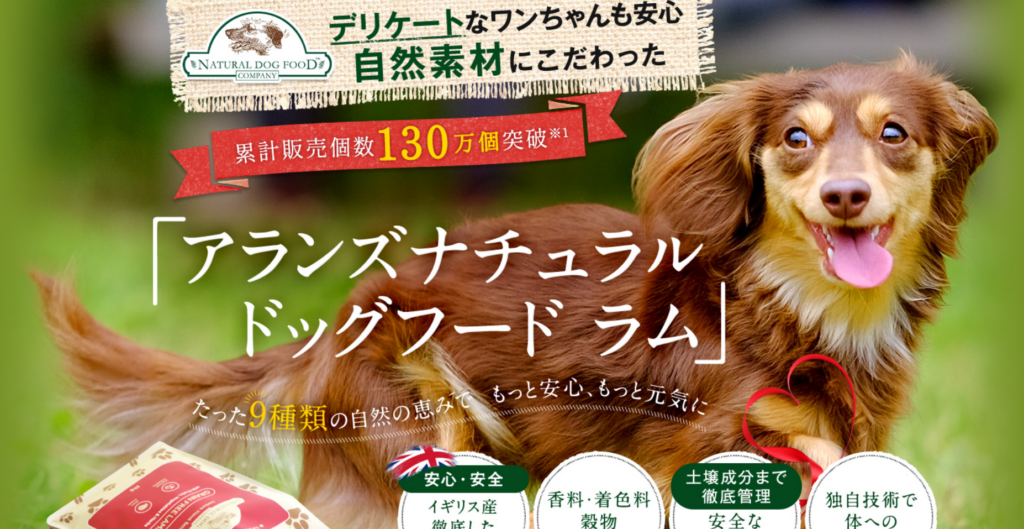 アランズナチュラルドッグフードは、シンプルな原材料構成と自然志向を重視したプレミアムフードです。ラム肉を主原料とし、必要最低限の素材のみで作られているのが特徴です。