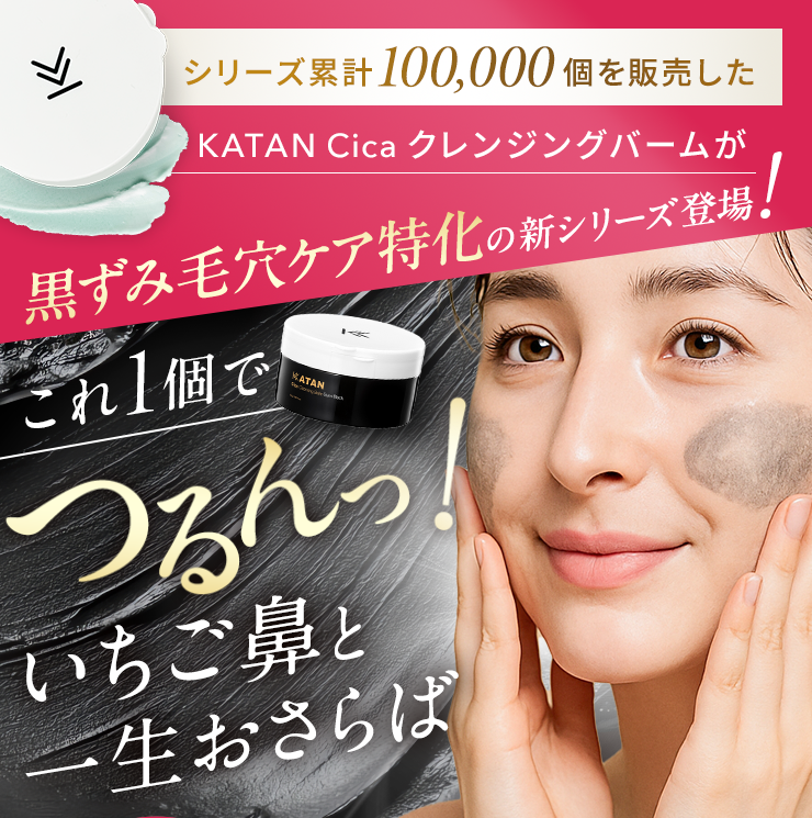 「KATAN 毛穴特化クレンジングバーム_炭ブラック」は、炭とクレイのW吸着技術で黒ずみ・角栓・皮脂汚れをしっかりオフする毛穴特化型バームです。こっくりしたテクスチャーは肌に乗せるとすぐにとろけ、毛穴に入り込んだ汚れを浮かせて吸着。さらに炭の微細構造によって皮脂を選択的に吸着するため、必要以上に肌の潤いを奪いません。30代以降の女性が悩みやすい「くすみ」「毛穴の影」「ざらつき」にアプローチできる処方が特徴で、毎日忙しいワーママでも時短で毛穴ケアが可能。W洗顔不要でまつエク対応、肌への摩擦も最小限に抑えています。